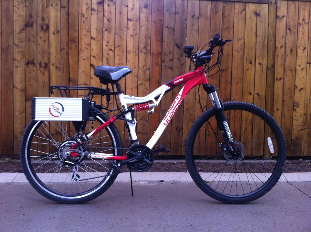 I read somewhere that someone was thinking of a 902 mini motor on the front in a dual drive setup. This way the front motor freewheels with no resistance and when an extra boost is needed it can be engaged. So here we are looking at the front of my Schwinn 29er. I have a bag hanging from the frame deciding where to put the controller. I end up changing it to a different bag later.