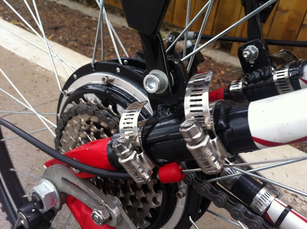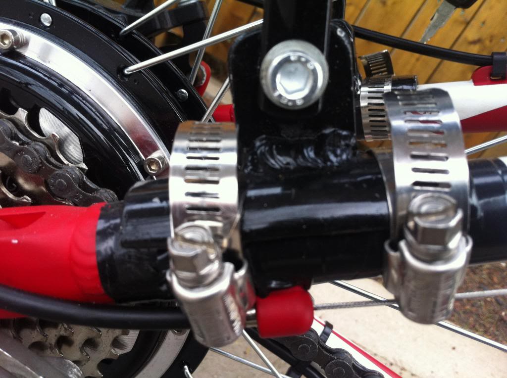 What you are seeing is black electrical tape around the frame. The new piece painted black and attached with two hose clamps. I will have to get smaller hose clamps to make it look a little cleaner. Now I have a spot for the rack to attach cleanly that is still somewhat flexible. I added three washers in between everything so it flexes nicely.