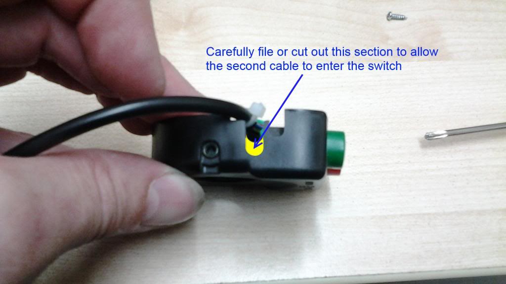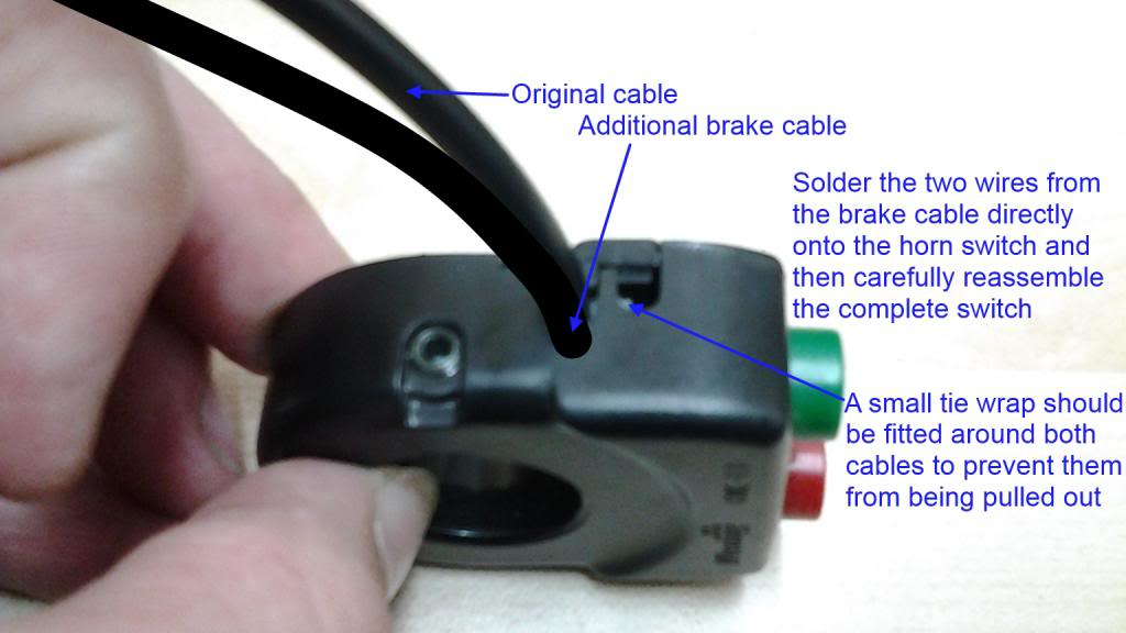 You can either carefully cut into the middle section of the cable instead to reveal the four inner wires ready for cutting, insulating and splicing, or it might be neater to run the brake wire direct to the switch