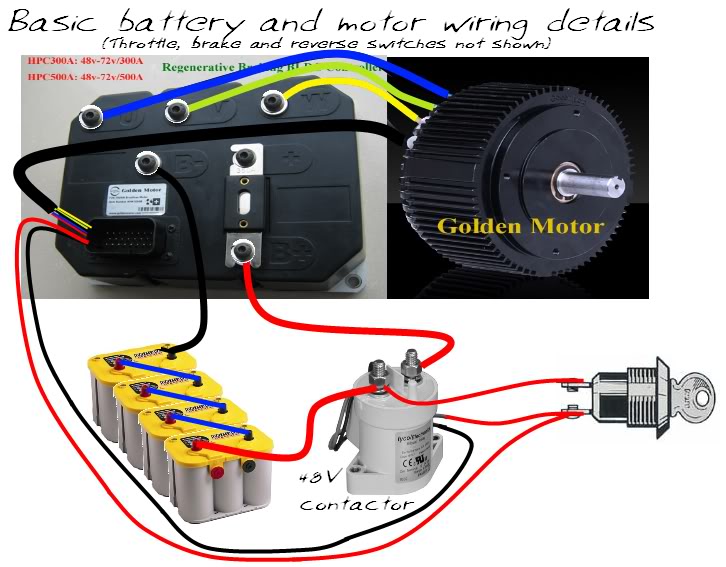 The black wire is to the B- and negative pole of battery, the multi pin plug is for throttle, regen and hall sensors