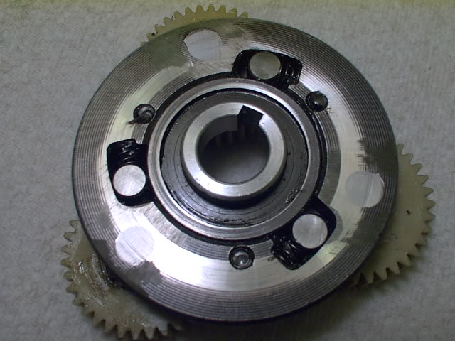 The clutch is very simple and comprises of three cylindrical rollers which are gently held by springs into the narrow end of a wedge shaped opening.