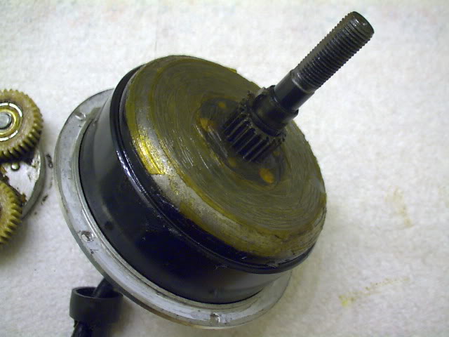 This drum has a small gear attached to the opposite side (see picture below) and the whole assembly is mounted to the axle by a bearing inside the gear, which allows the whole drum assembly to freely rotate around the fixed axle when power is applied to the windings via the controller.