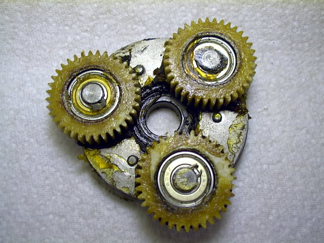 The following two pictures show both sides of the intermediate gears (known as the Planet Gears) which are driven by the motor's small gear (the Sun Gear) and are mounted on a unidirectional clutch (a special type of ratchetless freewheel), which is secured onto the axle with a key and slot to prevent the centre piece from turning.