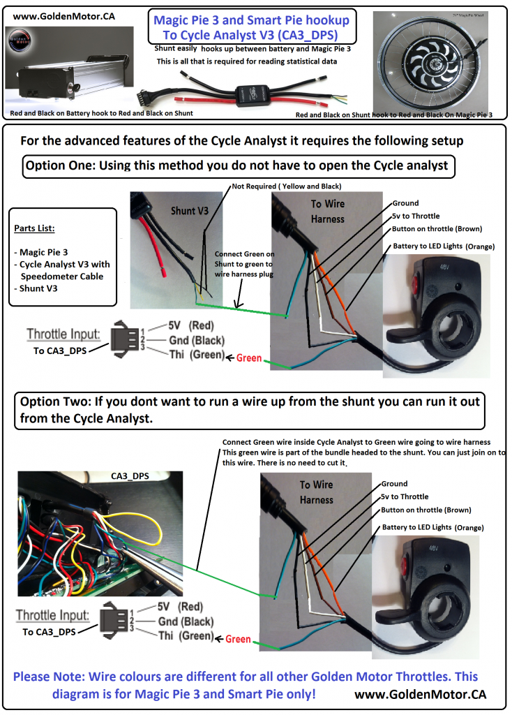What I really did not enjoy was with the V2 cycle analyst you needed to do some soldering on the circuit board inside the CA. I did this several times for myself and friends but did ruin one CA v2.3 board. Now it is much easier, People don't even have to open it if they don't want to. When I was taking with Justin on the phone he suggested the method I showed in the first diagram as well as running all three wires though the CA in this diagram. Either would work fine. This method uses the 5v feed and ground from the CA instead of from the GM controller. Adding a JSM plug would make it really neat and simple.