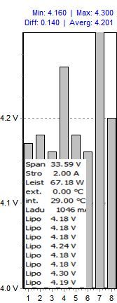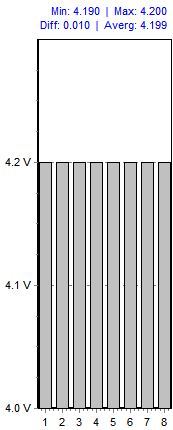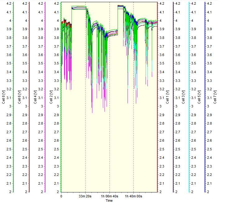 The following graph shows the differing cell voltages in a faulty 8 cell LiPo pack with blown cells which are still very imbalanced due to using a rapid "non-balanced" charging mode