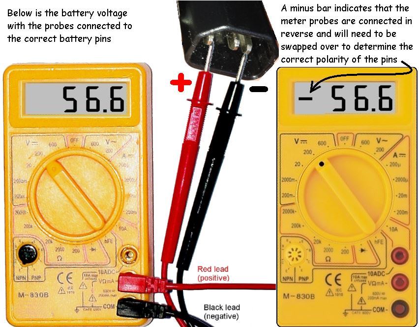 To avoid and confusion with the orientation of the plug and socket, it might be better to plug the open half of the controller connector into the battery connector and then measure the battery polarity on the controller plug connections.