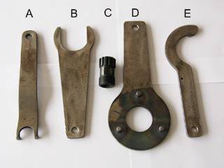 (E) "C" spanner used for undoing and tightening locking rings as in 2nd photo down from the top.