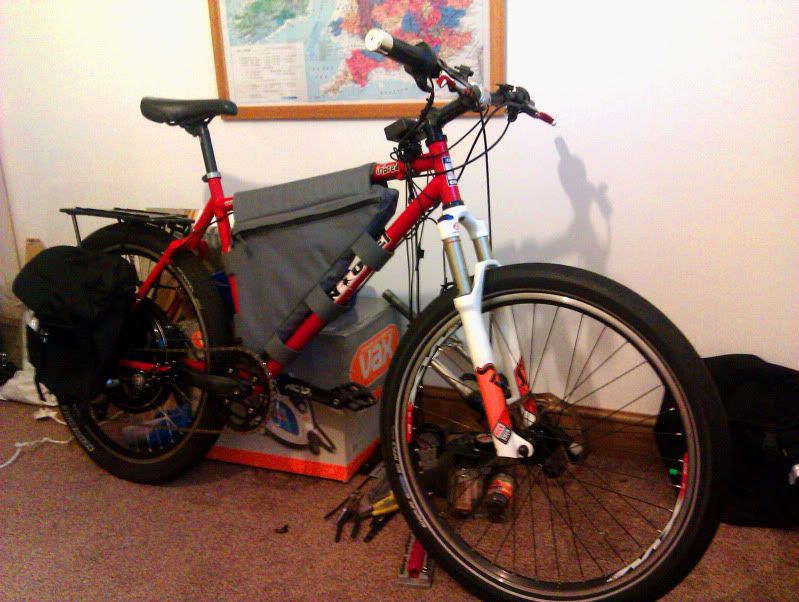 To Avantgarder,  I will try and take a picture of my finished red bike(above) with the blue bag attached.  I've managed to get an 84v / 12ah( 2x36v packs in series, although packs are custom made shapes) into this bag with room left for an Infineon controller, all wires and a choc box with a voltage converter inside to power a rear light.  1000D Kordura is heavy duty and fairly stiff.  The weight of my packs and accessories must weigh about 9 or 10kgs.