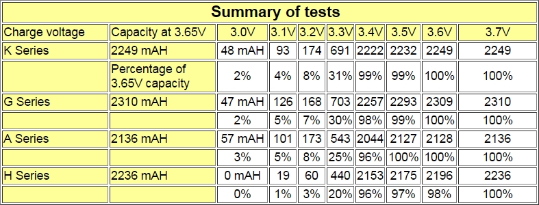 At a maximum charging voltage of 3.4V per cell there was only a minor loss in capacity of between 1% and 4% compared with the 3.6V per cell for the four different types of 18650 LiFePO4 cells tested.