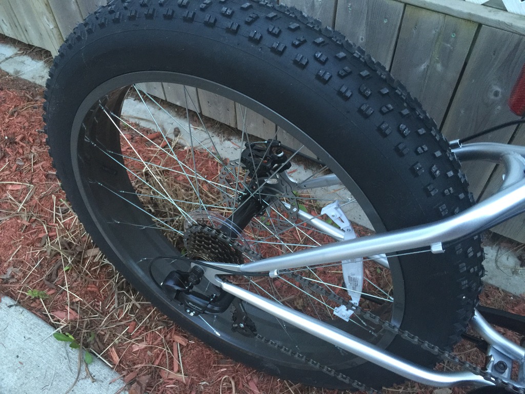 For sure a rear wheel would be desirable on this bike (or any bike) but it has 135mm front and 165mm rear. My fat kits are 135mm front and 195mm rear. So I don't have a wheel to fit the back (yet).