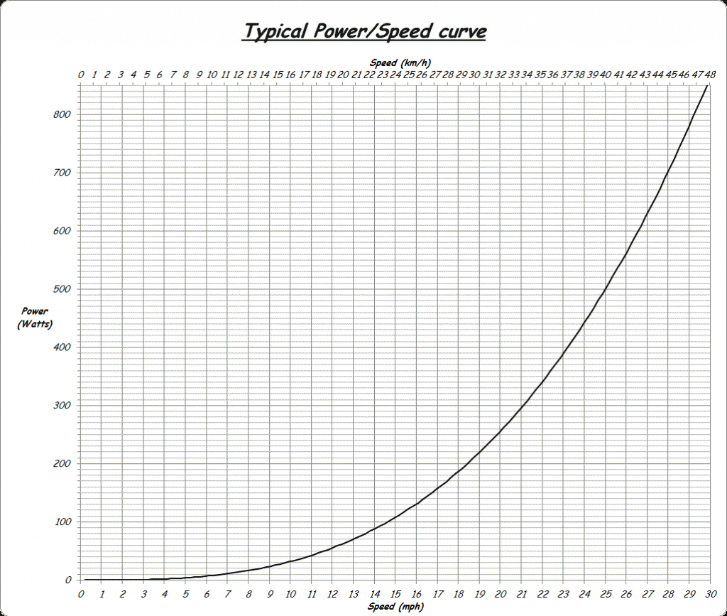 The increased aerodynamic drag of a strong headwind will have a dramatic effect upon battery consumption, and the following graph shows how a small increase in speed will greatly increase the required power to maintain that speed: