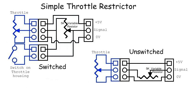 The big problem with either method of limiting the throttle is in my opinion that it has no effect when using the pedelec.  Maybe the "speed limiter" connection as described in "Re: Variable Regenerative braking" could somehow be used for that?