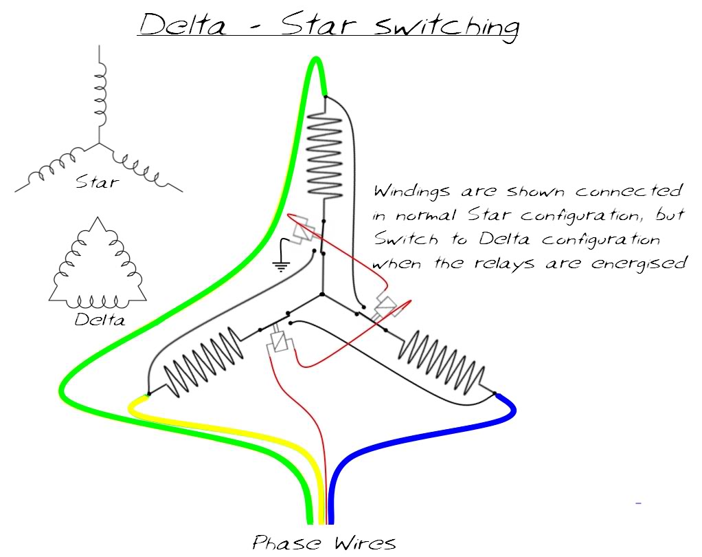 The Yellow phase lead connects to the switched end of the Green windings