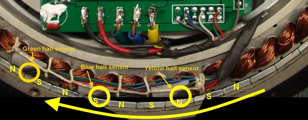 Now I'm confused ??? in my original diagram, I presumed that the phase order was "Yellow - Blue - Green", because this is the order in which the magnets pass the hall sensors on my Pie when the wheel is turned in a forward direction: