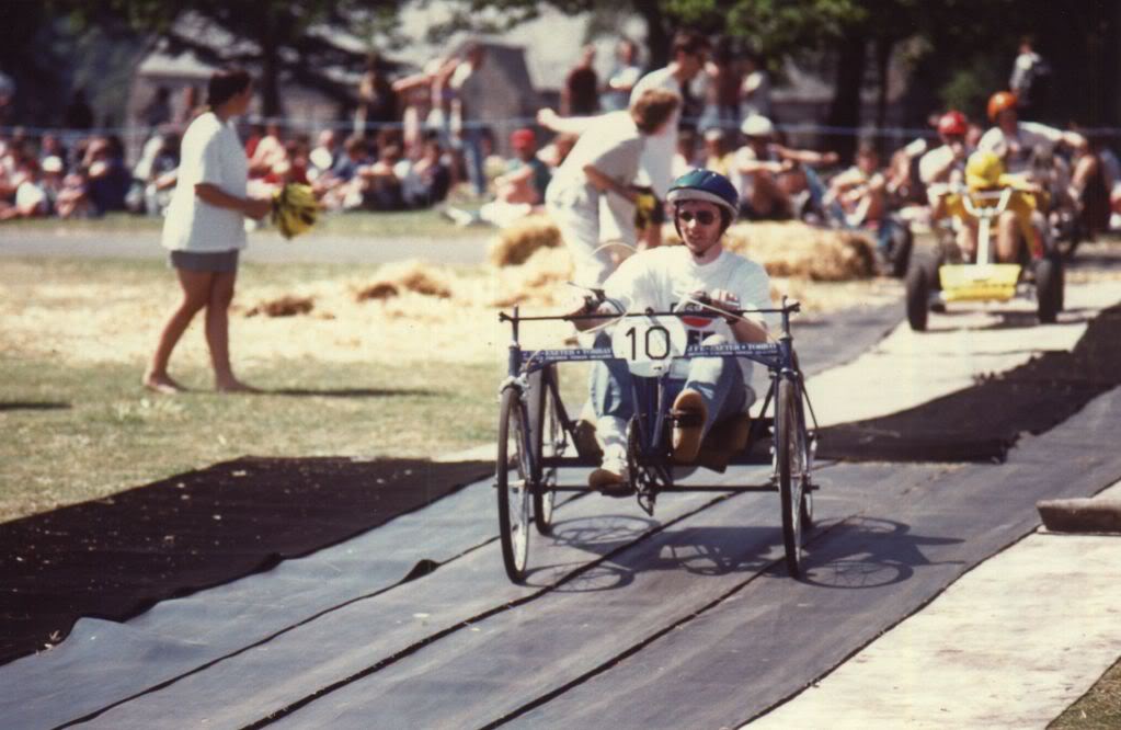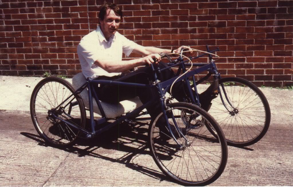 About fourteen years ago, I was given ten days to build a "pedal car" which was constructed mainly from some old bikes from the local recycling centre along with a few scrap pieces of metal tubing and plywood etc, as we had signed up at short notice to compete in a two hour long charity "Pedal Car Grand Prix", and this was the result a week later: