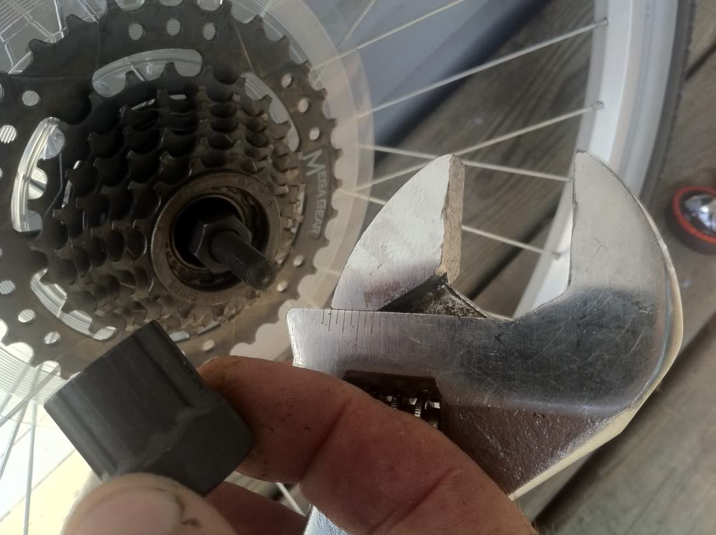 Then with the wheel removed, you have to unscrew the freewheel in an anticlockwise direction using a freewheel removal tool and a suitable wrench. This is if you want to use your existing freewheel. A six speed is ideal; a seven speed will involve a little bit more work.