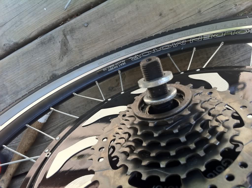 Next take all the washers and nuts off the wheel except one flat one on each side. If you are using a seven speed freewheel you will need to have at least 2 or 3 washers on that side to prevent the freewheel from binding against the frame. You also have to ensure the washers do not make contact with the freewheel in any way or it will bind.