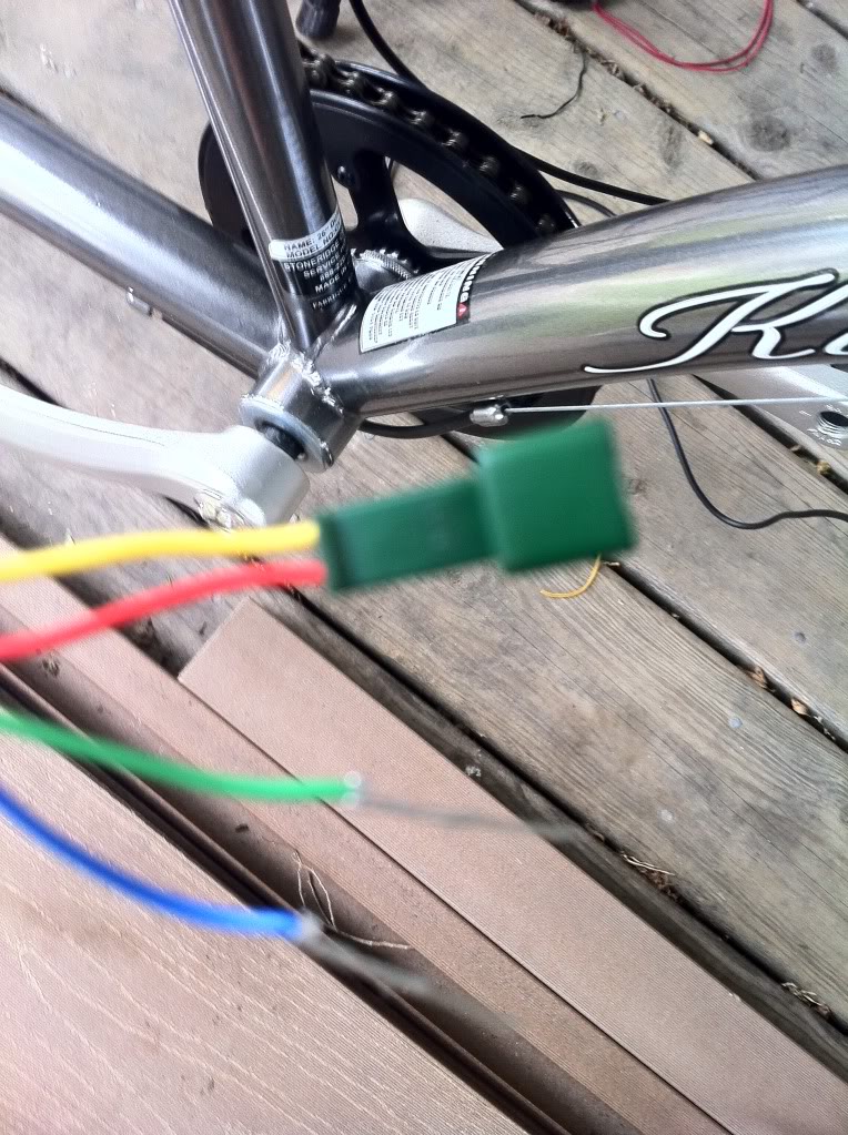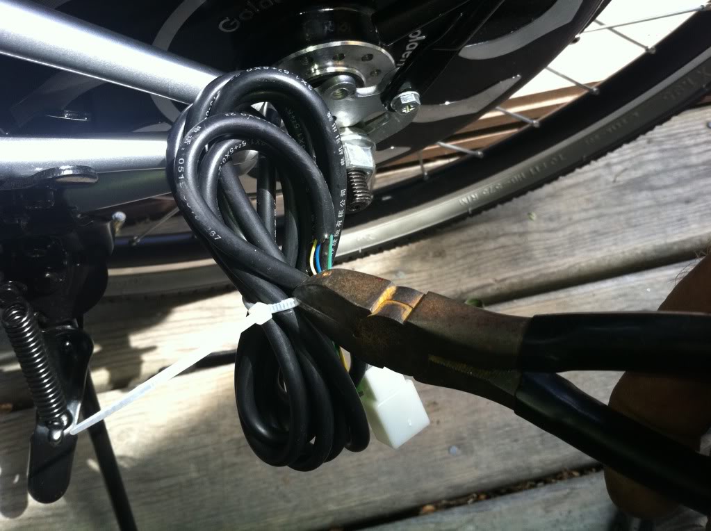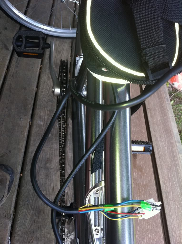 Next pick a location for all the wires to meet the controller. I like hanging a pouch under the seat. Others prefer the controller box under the rack. Remove the plastic tie from the motor wires and then run them to the Pouch (in my case). In through the bottom and out the zipper opening.