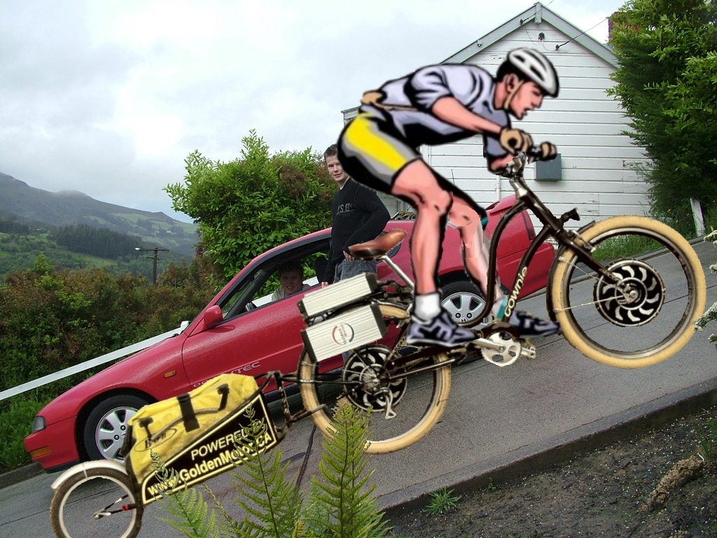 Not sure what the grade is on the bridge in this video, maybe someone can estimate it from a freeze frame. I was riding the bike in Alan's picture with my trailer in tow. One MP III on the back and two 48V10AH batteries.