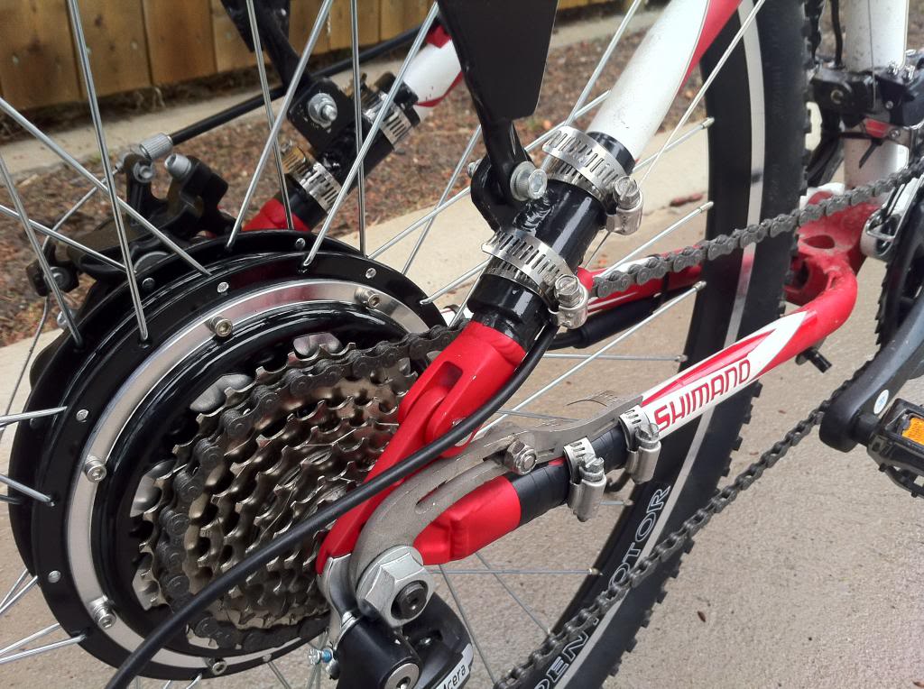 I read somewhere that someone was thinking of a 902 mini motor on the front in a dual drive setup. This way the front motor freewheels with no resistance and when an extra boost is needed it can be engaged. So here we are looking at the front of my Schwinn 29er. I have a bag hanging from the frame deciding where to put the controller. I end up changing it to a different bag later.