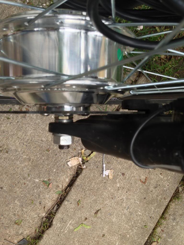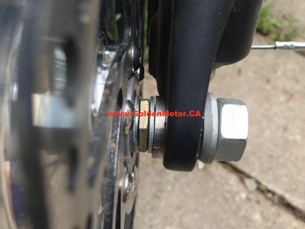 Now its back on the bike. No longer bent and jammed on the fork. But it is still rubbing one side of the brake caliper. So looking down at the axle you can see there is a nut and two thin spacer washers.