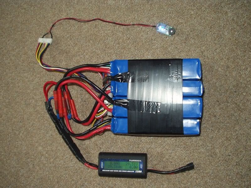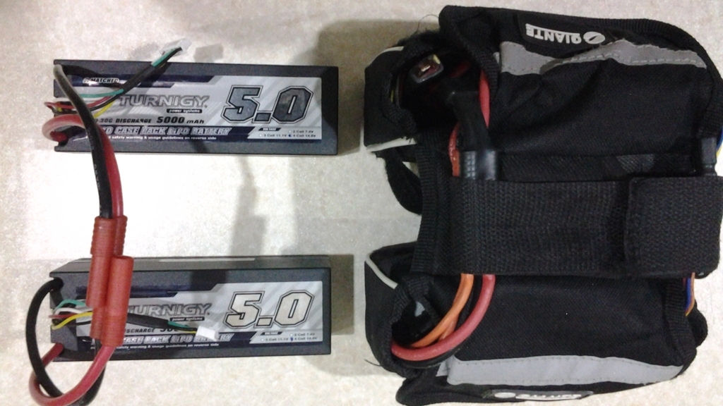 The smaller frame bag holds two Turnigy 4S 5Ah hard case packs connected in series to give a 29.6V 8S1P pack:
