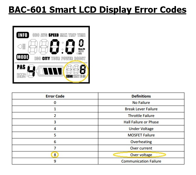 I get the error code "1" on mine when either of the brake levers are operated, but I think the later displays show E65 instead, which simply shows that the EBS is active. (E85 might have been better for EBS).